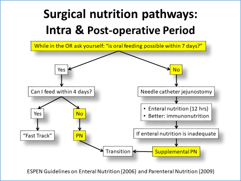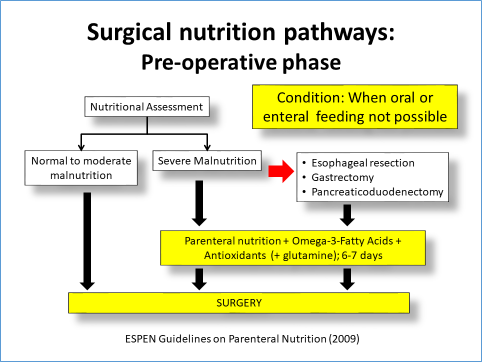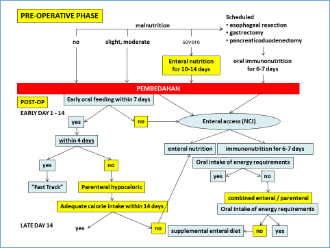 - Pre-Operatif=Pemberian Imunonutrisi dan reguler diet. Makanan padat dapat diberikan 6 jam sebelum pembedahan, dan liquid (air putih) hingga 2 jam sebelum tindakan anestesi, tidak ada bowel preparation.